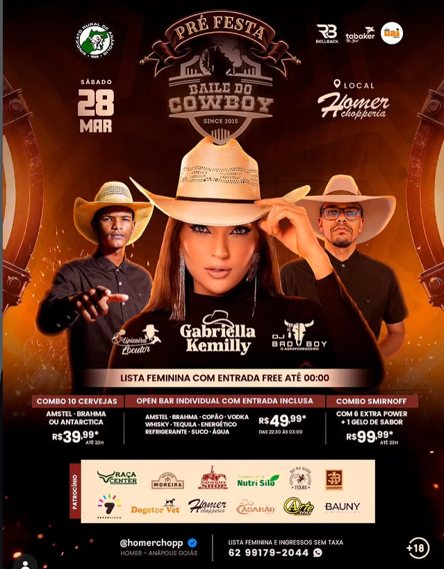 Neste sábado, tem a pré-festa do Baile do Cowboy no Homer, com a presença confirmada das candidatas a rainha da Expoana 2026. Quem comanda a noite é a DJ Gabriella Kemilly. Lista feminina com entrada grátis até às 00:00 no WhatsApp: 62 99179-2044.